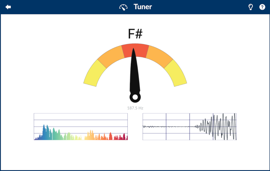 The tuner provides a graphical representation of the detected pitch and related information about the audio signal picked up by the microphone (or other input device).