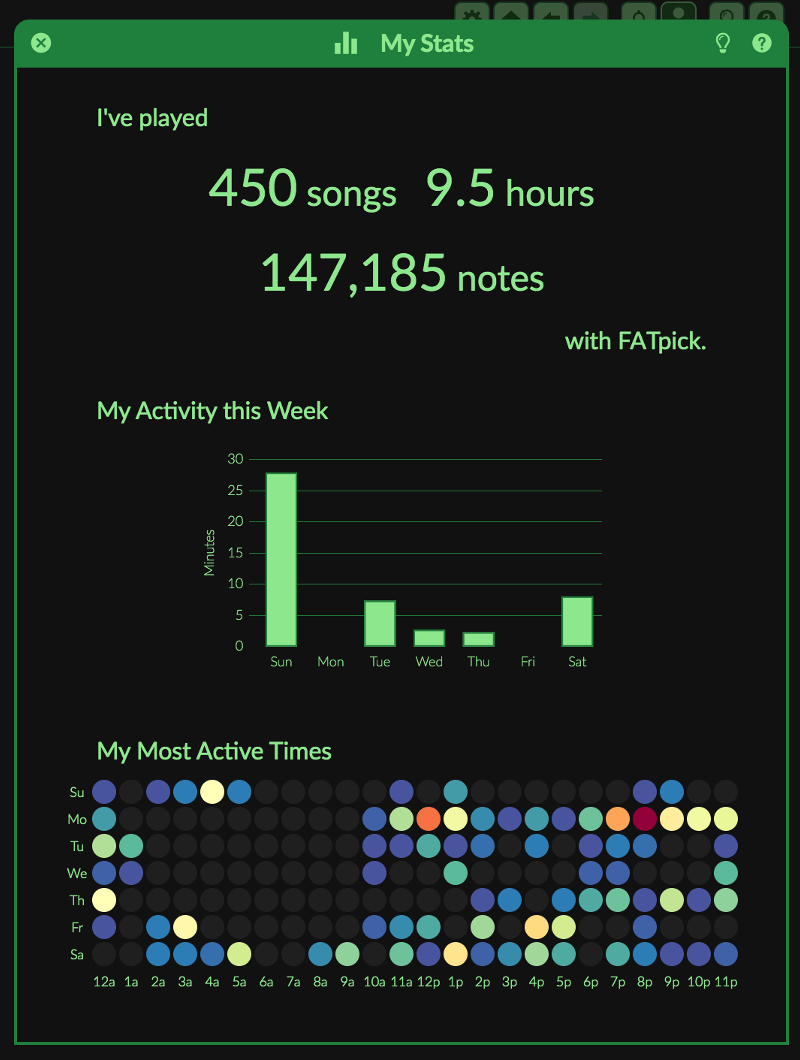 I've played - some basic metrics that total all of your activity in FATpick, including the number of songs you have played, the total practice time and the number of distinct notes that represents. These might be vanity metrics but it is gratifying to watch those numbers climb over time.