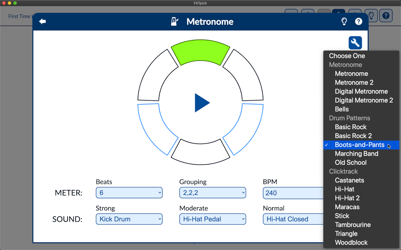 FATpick's in-app metronome is a sophisticated, stand-alone digital metronome that can be used for free-form practice to improve your rhythm and timing. The v2.4.3 release featured a major upgrade the metronome, integrating capabilities originally added as part of the previously released metronome track that can be used during game play.